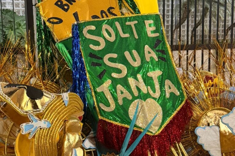 A primeira-dama Janja da Silva é mencionada em fantasia da escola de samba Acadêmicos de Niterói (imagem em destaque), cujo samba-enredo homanageia o presidente Luiz Inácio Lula da Silva (PT), domingo agora (15/2), no Rio de Janeiro. Uma das alas terá estandartes com a seguinte frase: “Solte sua Janja”.