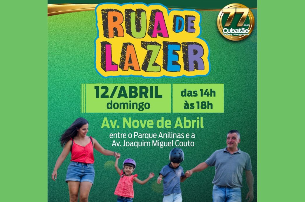 A Avenida de Diversão (nome oficial da ‘Rua de Lazer’) movimenta o Centro de Cubatão domingo agora (12), das 14h às 18 horas. Em clima de celebração pelos 77 anos de emancipação político-administrativa da cidade, os cubatenses conseguirão desfrutar o segmento interditado da Av. Nove de Abril para atividades esportivas e de recreação. A Rua de Diversão compreende o segmento entre o cruzamento da Av. Joaquim Miguel e o Parque Anilinas. A ação é promovida pelas secretarias de Esportes e Diversão (Semes), Cultura, Turismo, com apoio de outras Pastas.