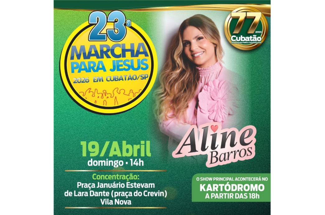 Em celebração aos 77 anos de emancipação político-administrativa, Cubatão promove a 23ª Marcha para Jesus, no próximo domingo (19), com início das 14h. A concentração é na Praça Do Crevin, na Vila Nova. O acontecimento é planejado através do Conselho de Pastores e Ministros Evangélicos de Cubatão (Unipec), com o suporte da Prefeitura Municipal.